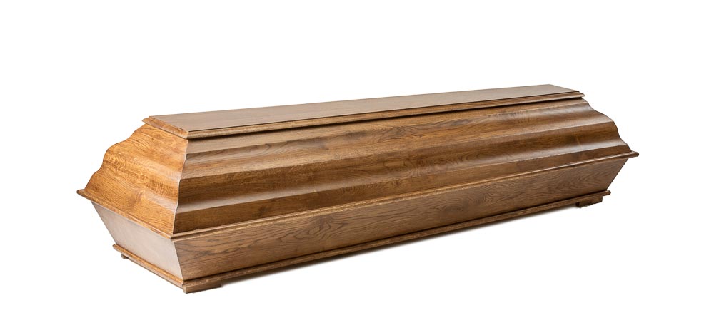 A classic-shaped oaktree coffin with a curved lid, in a medium dark shade with oak texture.